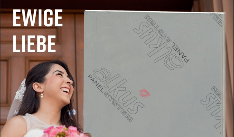 Sie ist groß. Sie ist grau. Sie besteht aus Kunststoff. Manche Produkte wirken äußerlich eher unscheinbar, obwohl sie echte Innovationen sind – so wie die alkus® Vollkunststoffplatte. Wie bewirbt man also eine große graue Platte aus Kunststoff? Wir haben uns dafür entschieden, ihre inneren Werte zu zeigen – im übertragenen Sinne und mit einem Augenzwinkern. In einer neuen Anzeigenreihe mit dem Motto „Ewige Liebe“ posiert die alkus® deshalb als stolzer Bräutigam und Partner fürs gesamte (Berufs-)Leben im Arm einer hübschen Braut.