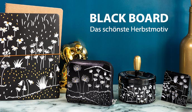 „Black Board“ lebt von dieser Spannung zwischen den klassisch kühlen schwarz-weißen Elementen und den auflockernden goldenen Lichtsprenkeln. Sie wecken Assoziationen an einen Spaziergang unter den Sternen in einer warmen Herbstnacht, wenn das Mondlicht der restlichen Welt ein nahezu magisches Aussehen verleiht. Das „Black Board“-Design ziert sowohl nützliche Utensilien für Herbst und Winter wie Schal, Thermoskanne und -becher als auch Gegenstände für das ganze Jahr – wie Geldbeutel, Brillenetui, Handgepäckskoffer oder Parfumzerstäuber.