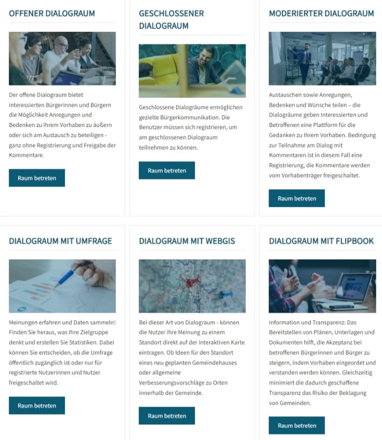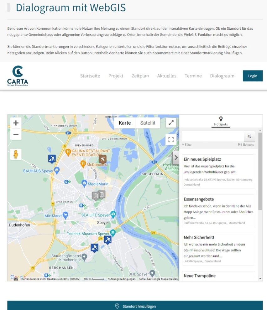 CARTA DIALOG macht Öffentlichkeitsbeteiligung flexibel, einfach und schnell. Unsere digitale Plattform für Bürgerkommunikation bietet exakt auf Ihren Bedarf zugeschnittene Funktionen wie offene oder geschlossene Dialogräume, Infoseiten, Timelines oder kommentierbare Übersichtskarten. Alle Module sind bereits vorkonfiguriert und werden inhaltlich und optisch an Ihr Vorhaben angepasst.