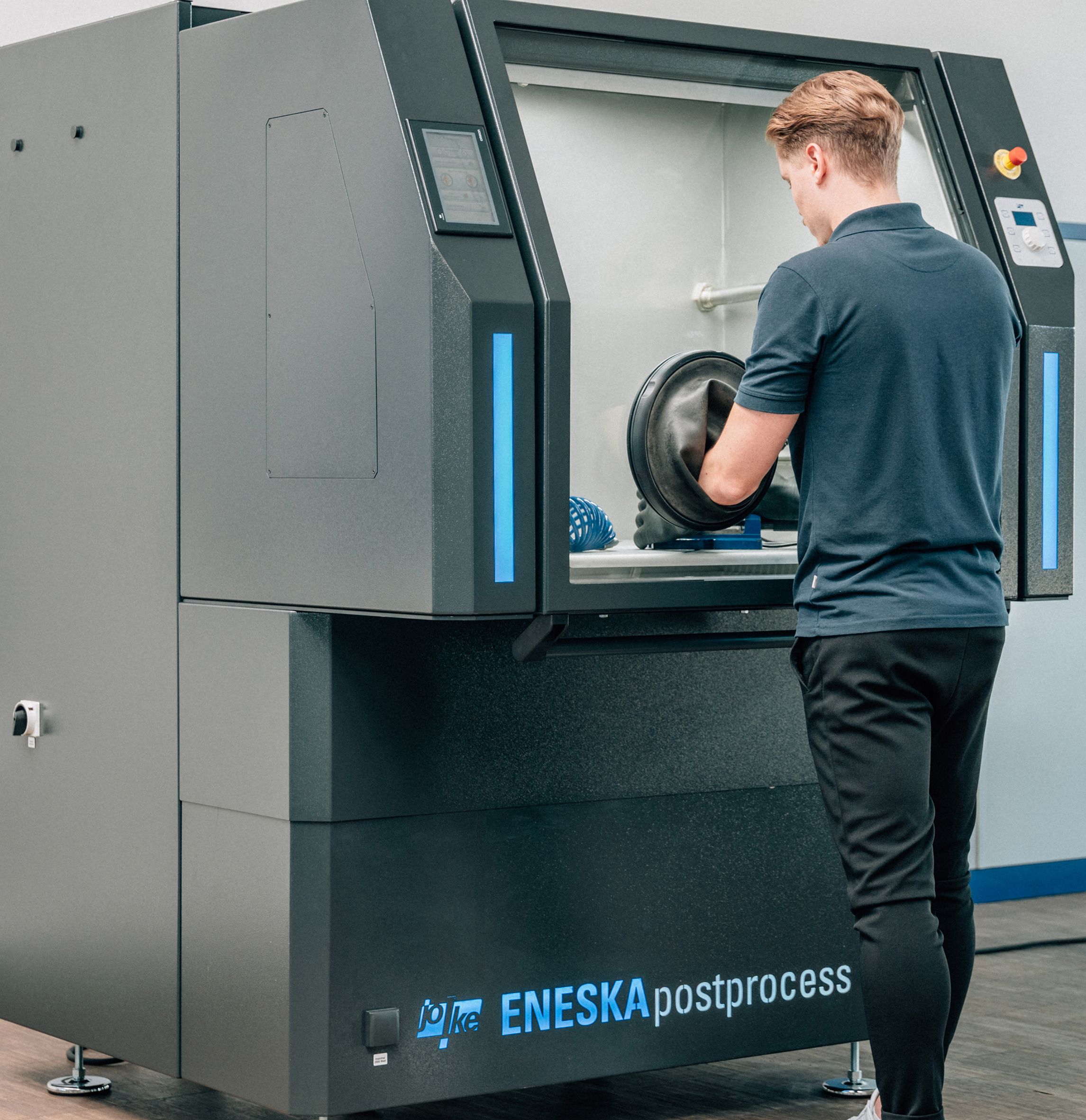 Die Bearbeitung der Werkstücke mit der ENESKApostprocess erfolgt über abgedichtete Handeinlässe, die ins Innere der Station führen. Sie ermöglichen einen großen Bewegungsspielraum und unverkrampftes Arbeiten im Stehen oder Sitzen. Dabei bietet die vollverglaste vordere Hauptklappe einen optimalen Blick auf das Bauteil und die eigene Arbeit. Pulver und Stäube, die während der Bearbeitung anfallen, werden materialgerecht gefiltert und sicher zur Entsorgung eingesammelt. So wird schwerwiegenden Gesundheitsschäden, wie Herz-Kreislauf-Erkrankungen, der sogenannten Staublunge oder Hautreizungen vorgebeugt. Zudem werden je nach Material mögliche, potenziell lebensbedrohliche Staubexplosionen oder -verpuffungen vermieden. „Die ENESKApostprocess schützt Fachpersonal und Räumlichkeiten und macht Schutzkleidung und weitere Sicherheitsvorrichtungen überflüssig“, erklärt der Produktmanager.